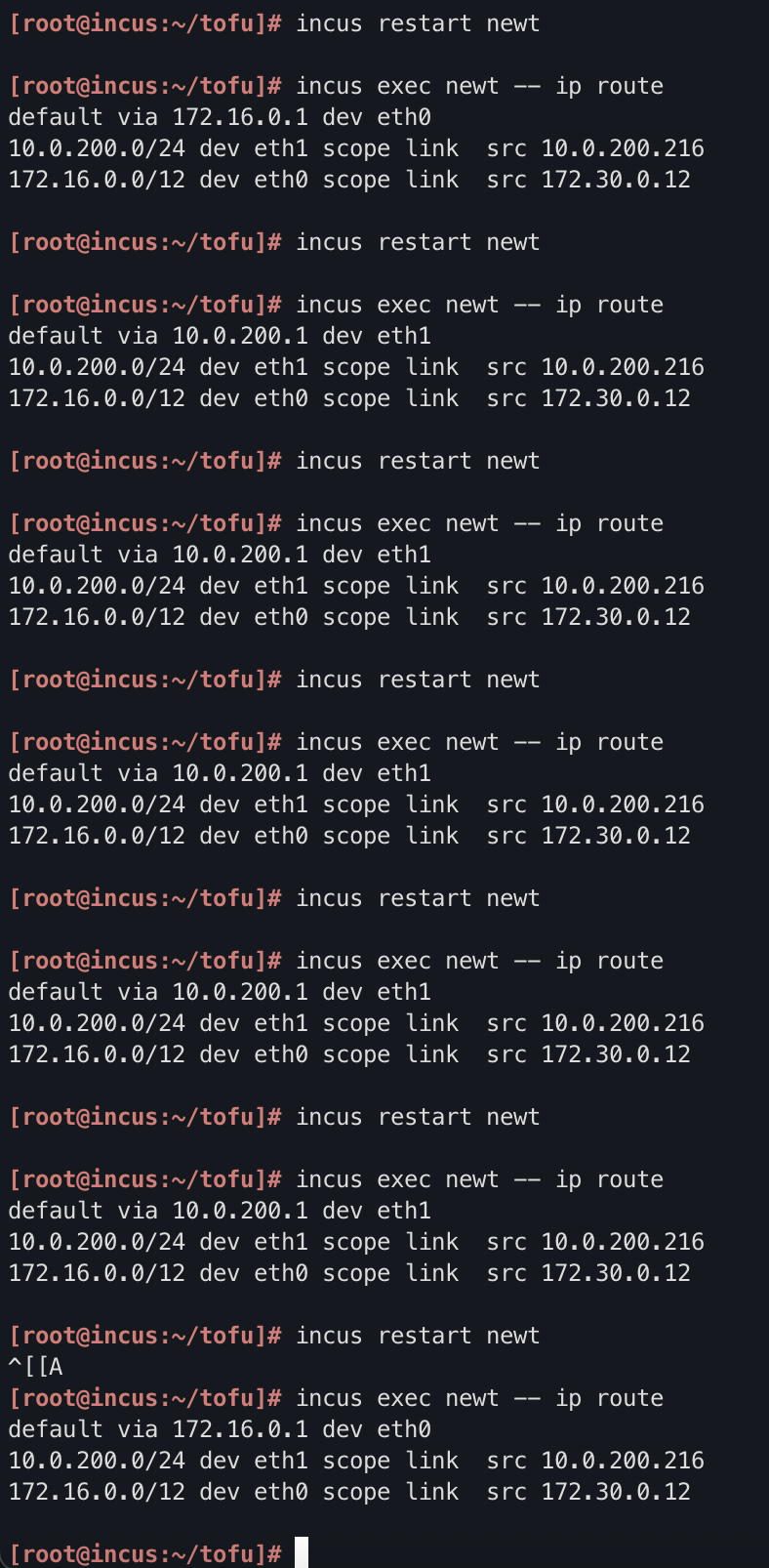 - Containers connect to both networks, and use the incus DNS server.
