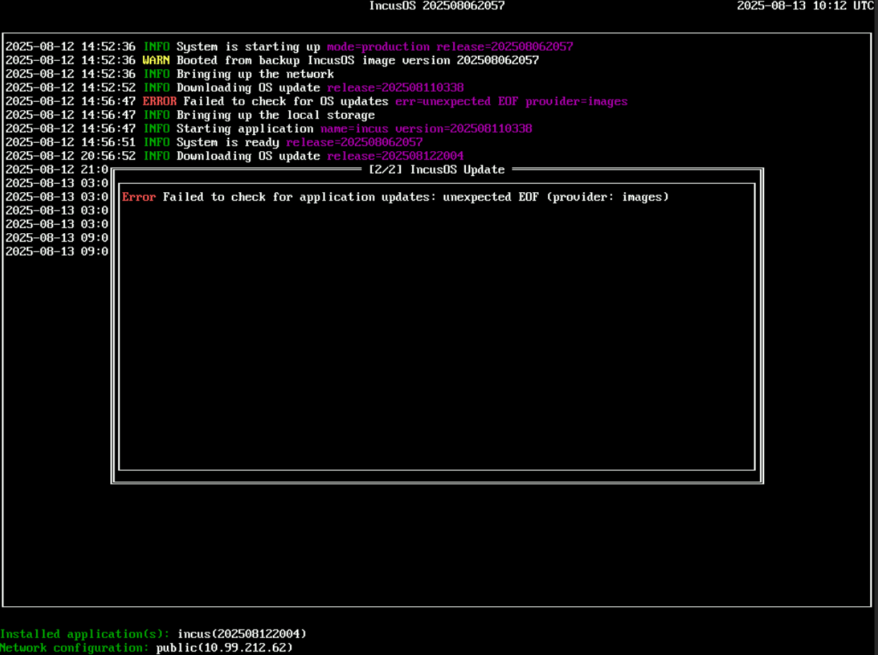 I’m stumbling across weird intermittent network issues with Incus OS images on images.linuxcontainers.org/os: updates often fail on NATed addresses but always succeed on machines possessing public IP addresses.