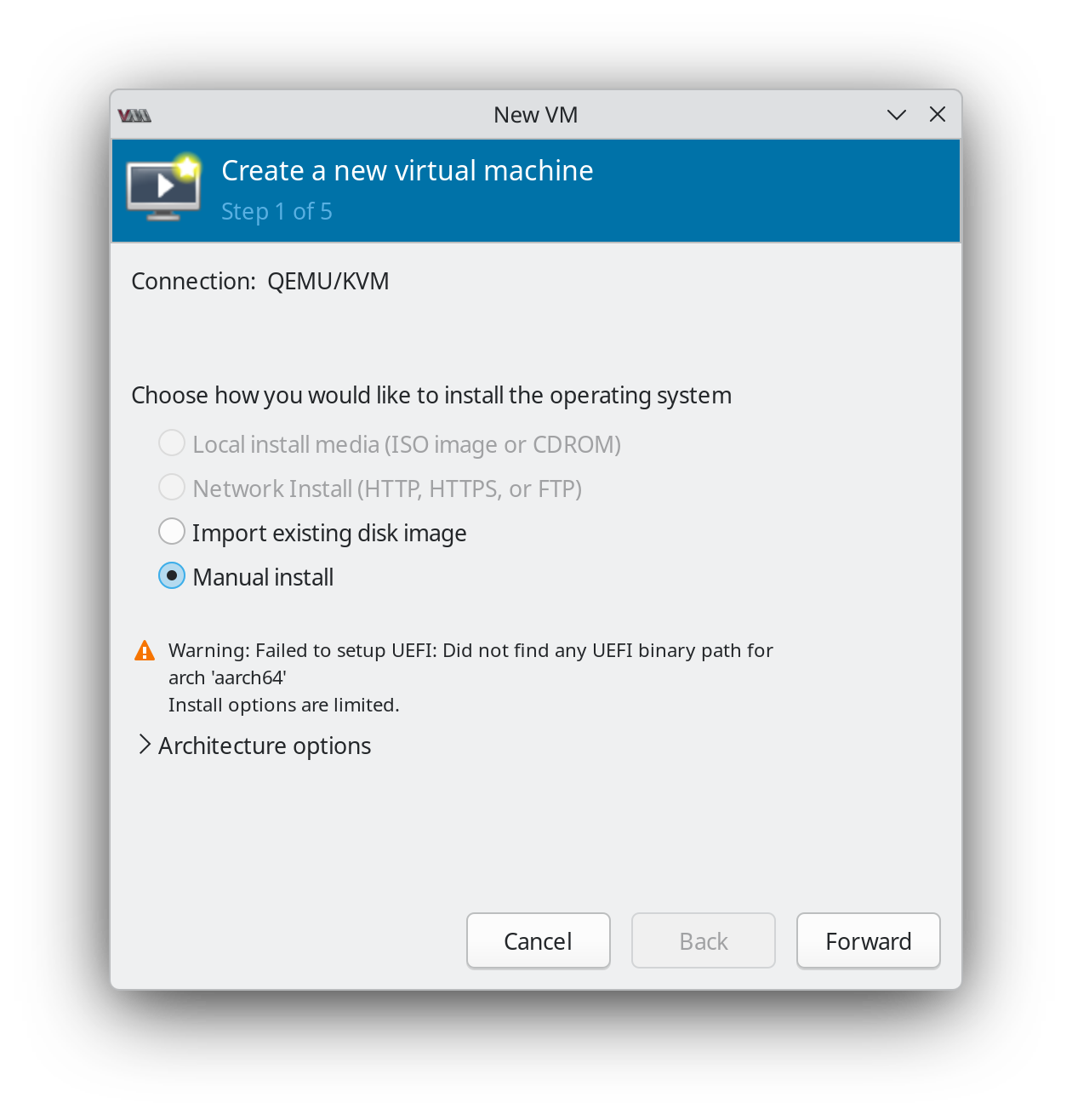 Error: Failed instance creation: Failed creating instance record: Instance type "virtual-machine" is not supported on this server: QEMU failed to run feature checks