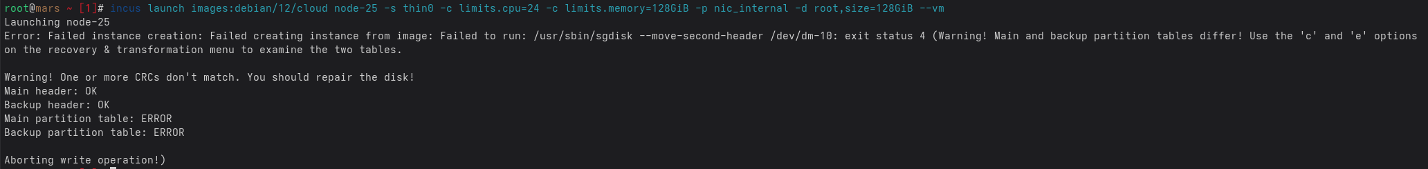 Error: Failed instance creation: Failed creating instance from image: Failed to run: /usr/sbin/sgdisk --move-second-header /dev/vg0/images_6dc6e0522da81db5c254e14e038860636e1e26edd3e6748d4a5f1d32df7c16aa.block: exit status 4 (Warning! Main and backup partition tables differ! Use the ‘c’ and ‘e’ options