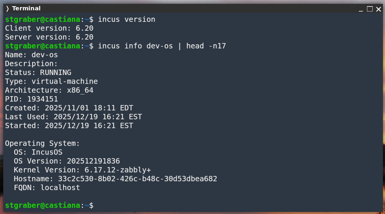 Back in Incus 6.18 we effectively turned off snapshots on all block volumes running on clustered LVM so we’d have a consistent user experience and avoid issues when users upgrade their operating system to a new major version.