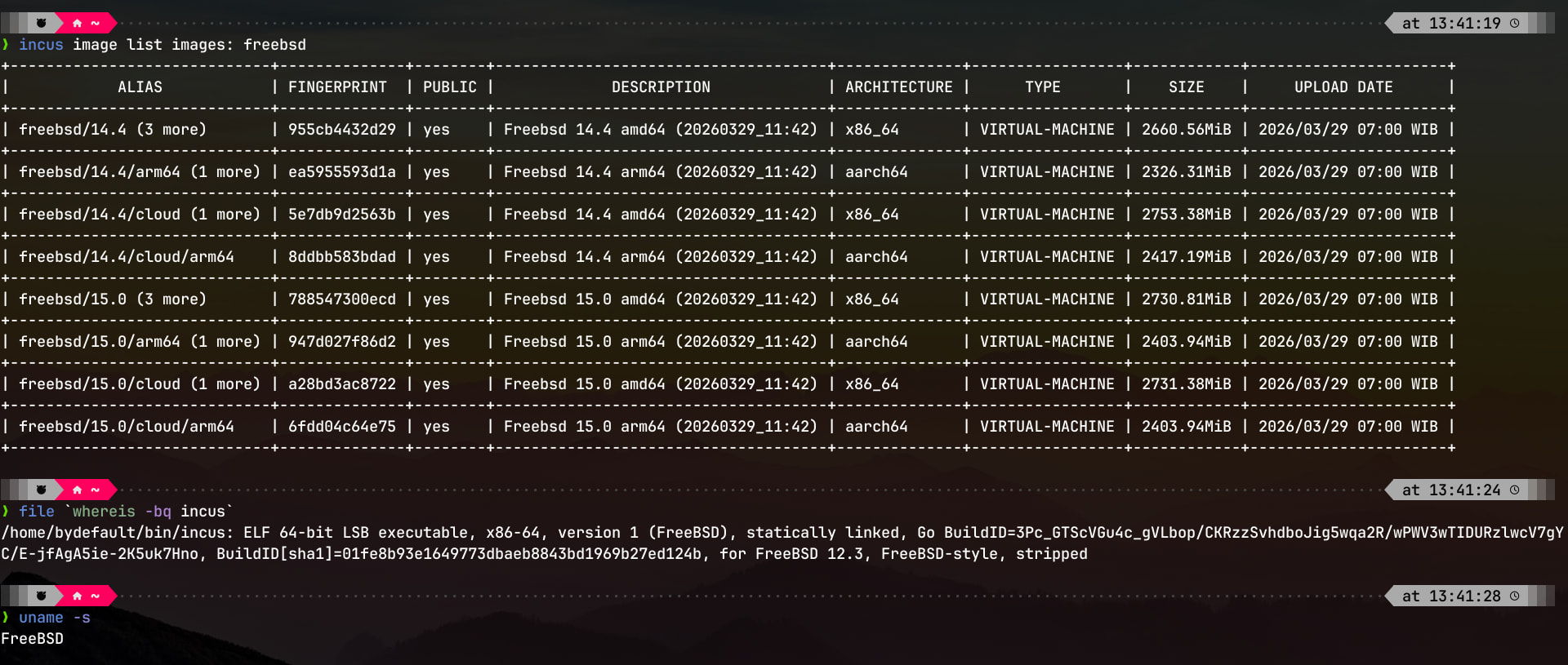 stgraber@castiana:~$ incus launch images:freebsd/15.0 bsd -c security.secureboot=false --vm