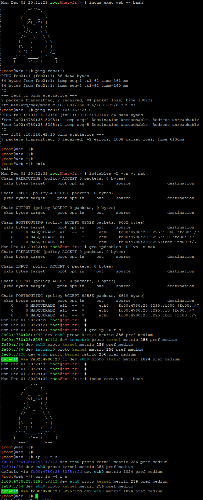 root@hst-fr:~ # incus network set incusbr0 ipv4.address=10.175.0.254/24 ipv6.address=fc00:4780:28:5295::fd/112