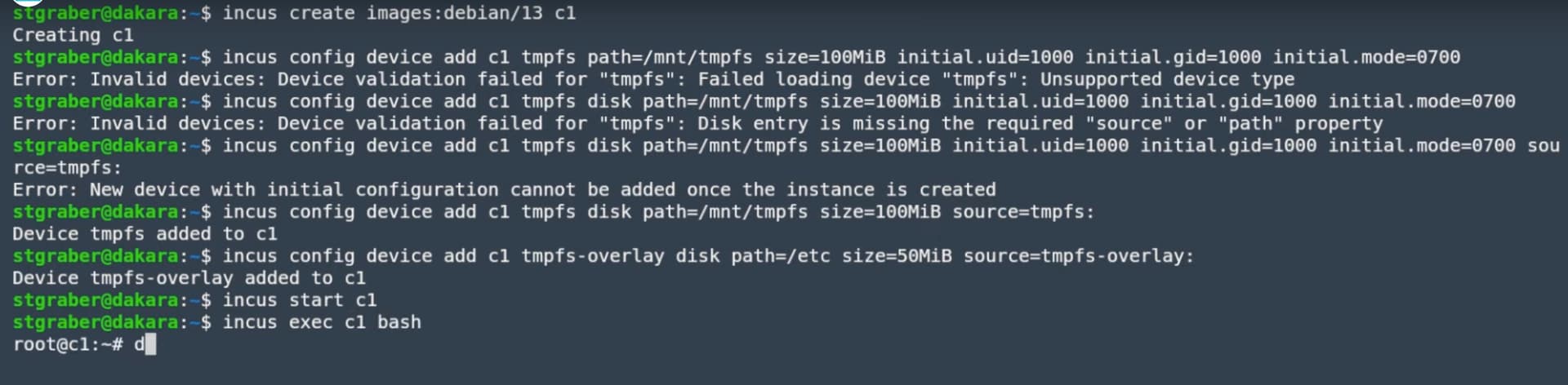 I followed the video instruction on Incus 6.16 has been released trying to setup a tmpfs-overlay device but it does not work. And incus doesn’t provide useful error message for me to findout what is going on.
