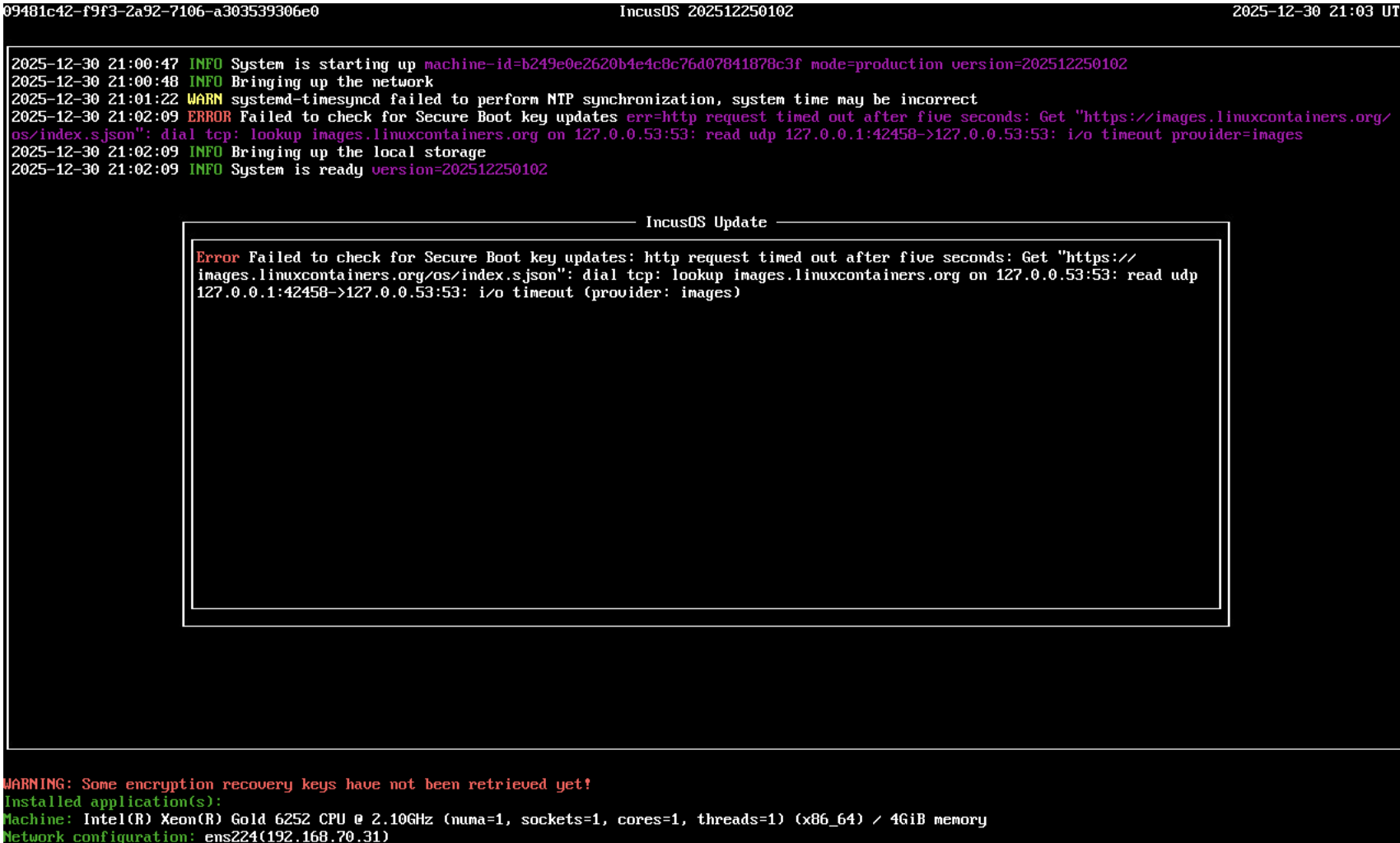 Progress using your network seed! It is now showing an IP address on the interface, but it is not responding to connection attempts and shows that it “failed to check for secure boot key…”
