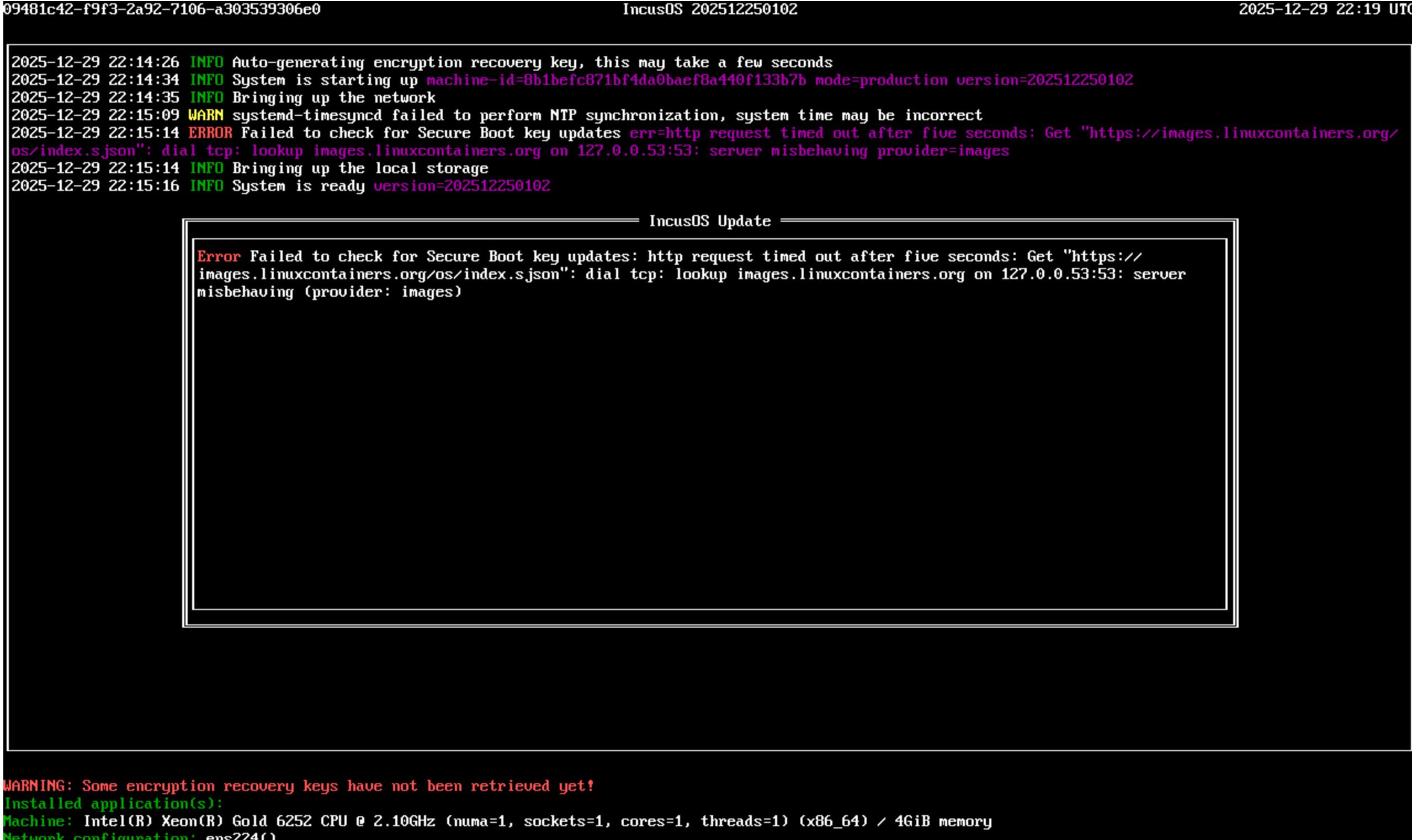 I am able to install Incus OS, but it does not get an IP address. I first downloaded the default ISO image and installed it (e.g., DHCP). Upon reboot, Incus OS loaded, but it did not get an IP address from DHCP.