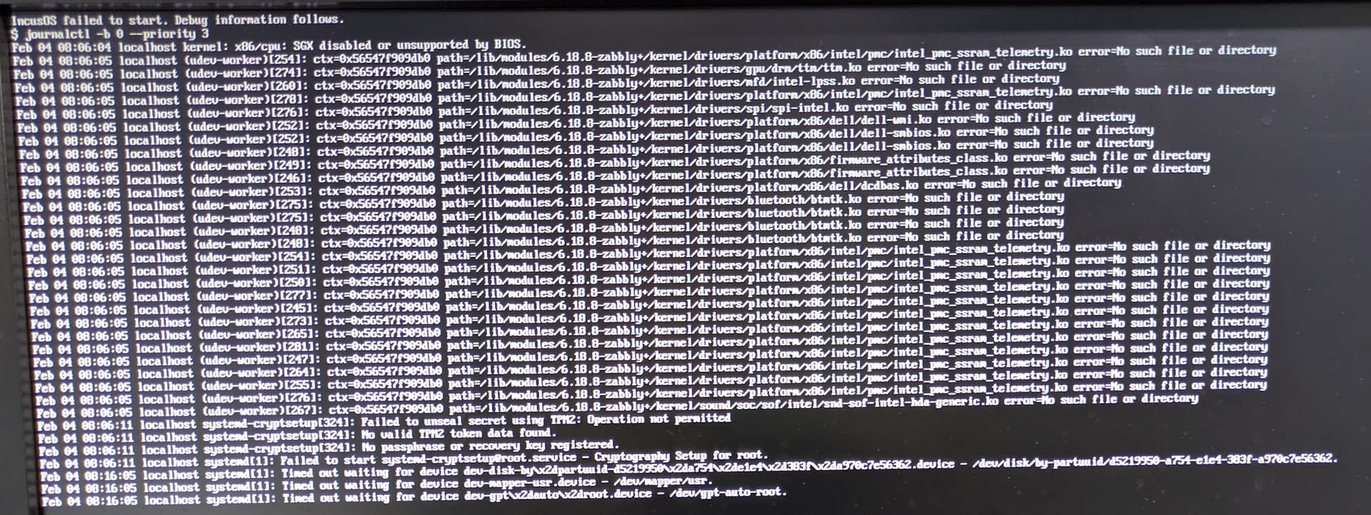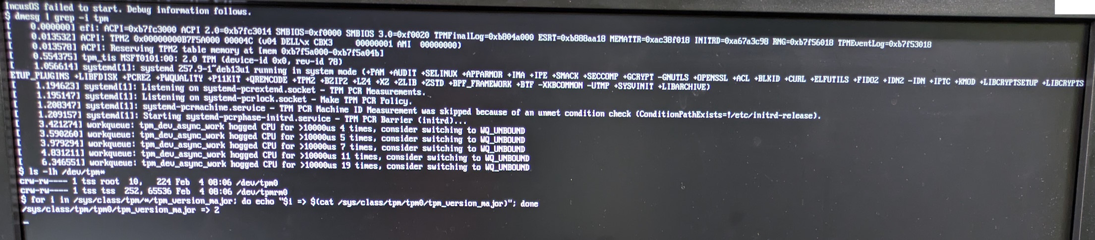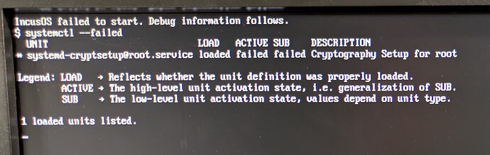 I tried to install IncusOS on a Dell OptiPlex 3090 but it fails because systemd-cryptsetup unit failed. In the debug logs 10 minutes after being stuck on IncusOS is starting, I can see: