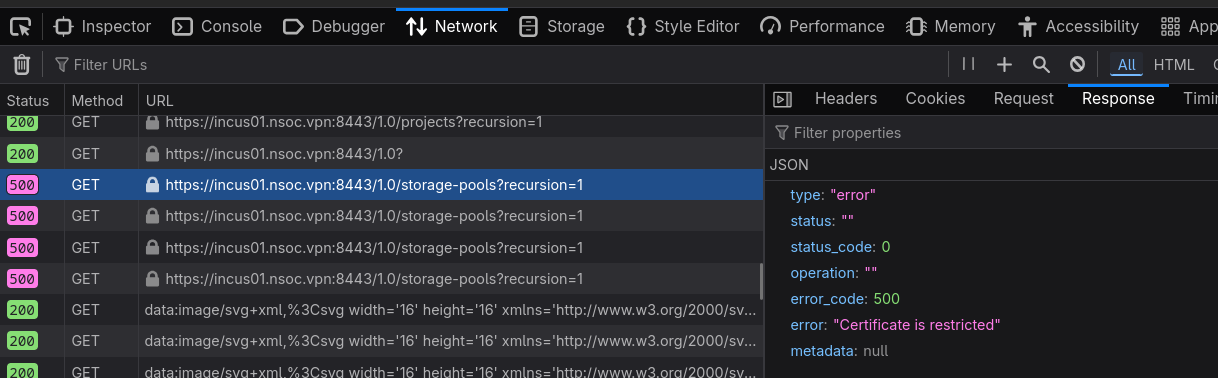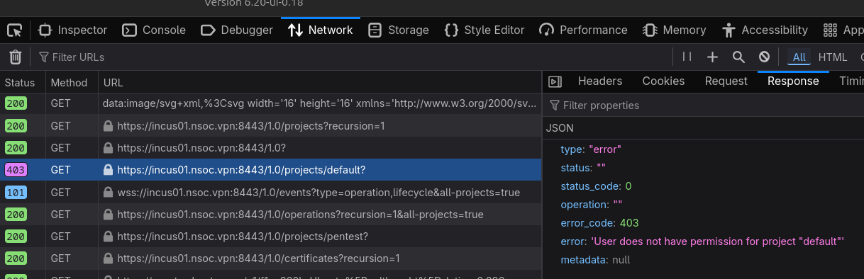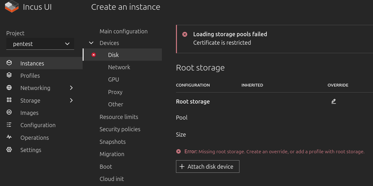 Add the TLS client to the incus daemon and restrict its use to the ‘pentest’ project with incus config trust add-certificate ~/Downloads/incus-ui-restricted.crt --projects pentest --restricted