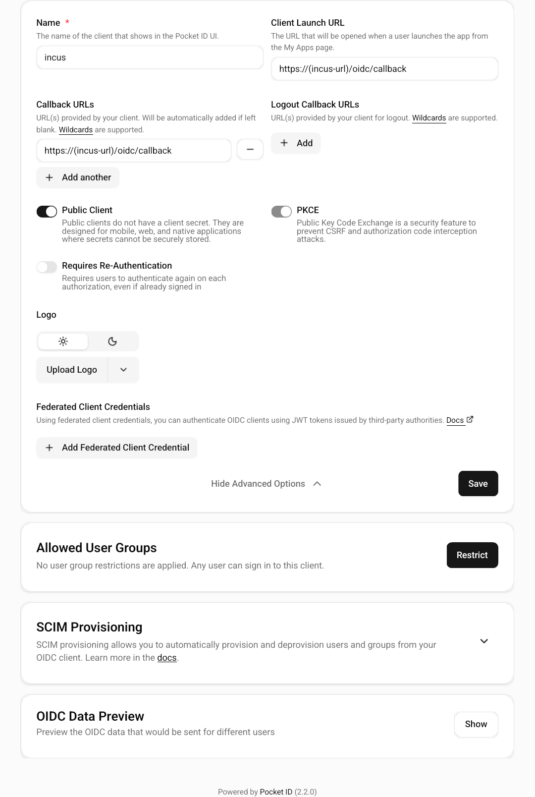 In pocket-id webui-OIDC clients-incus client page. You need to click Public Client, or else oauth will fail. You need to add whoever the users need to sso incus to Allowed User Groups, or else you cannot login.