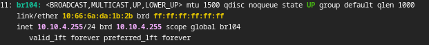 This is all well and good, except for when I want to add another node to my cluster. Now, these 2 nodes have the same IP address on their bridge interfaces, which while I can’t think of any specific problems this would cause, seems not ideal. An idea I tried was setting the address of the bridge to the broadcast address of that subnet, 10.10.4.255, which still works, but seems like a very hacky “fix”.