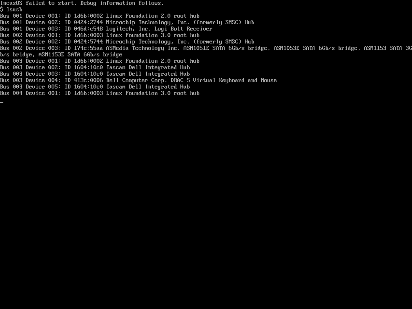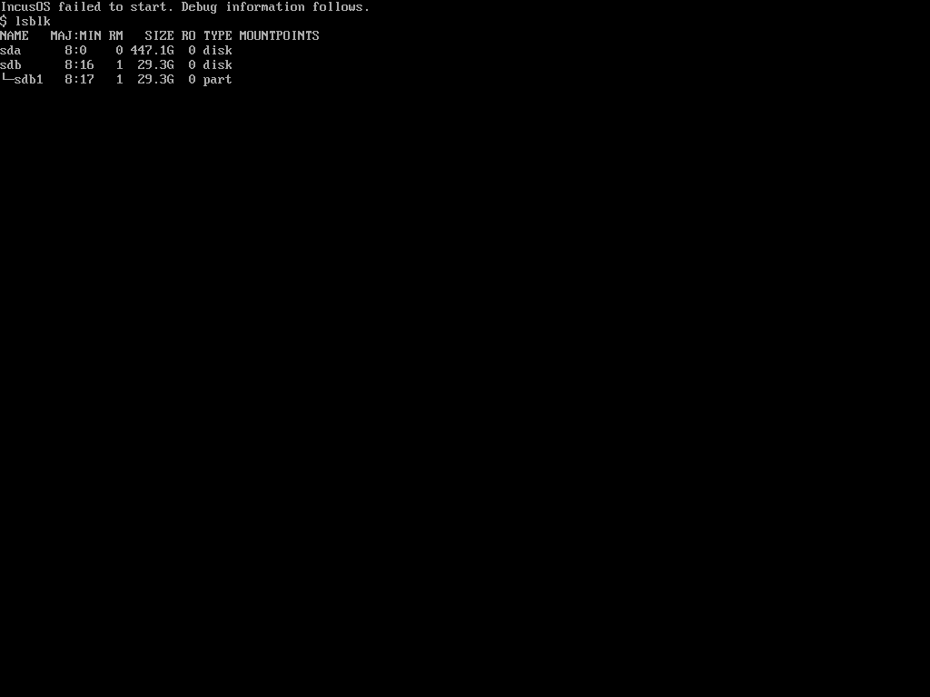I can boot from the drive, I get the IncusOS countdown, followed by IncusOS is starting… for 10 minutes until the timeout is hit the the debug information cycles. The debug information says nothing useful to me, it just seems to be the specs of the system. No information about what’s not working. So I’m stumped. The docs are a little light on how to run IncusOS off a USB drive like this, but the Image Downloader seems to suggest it should work.