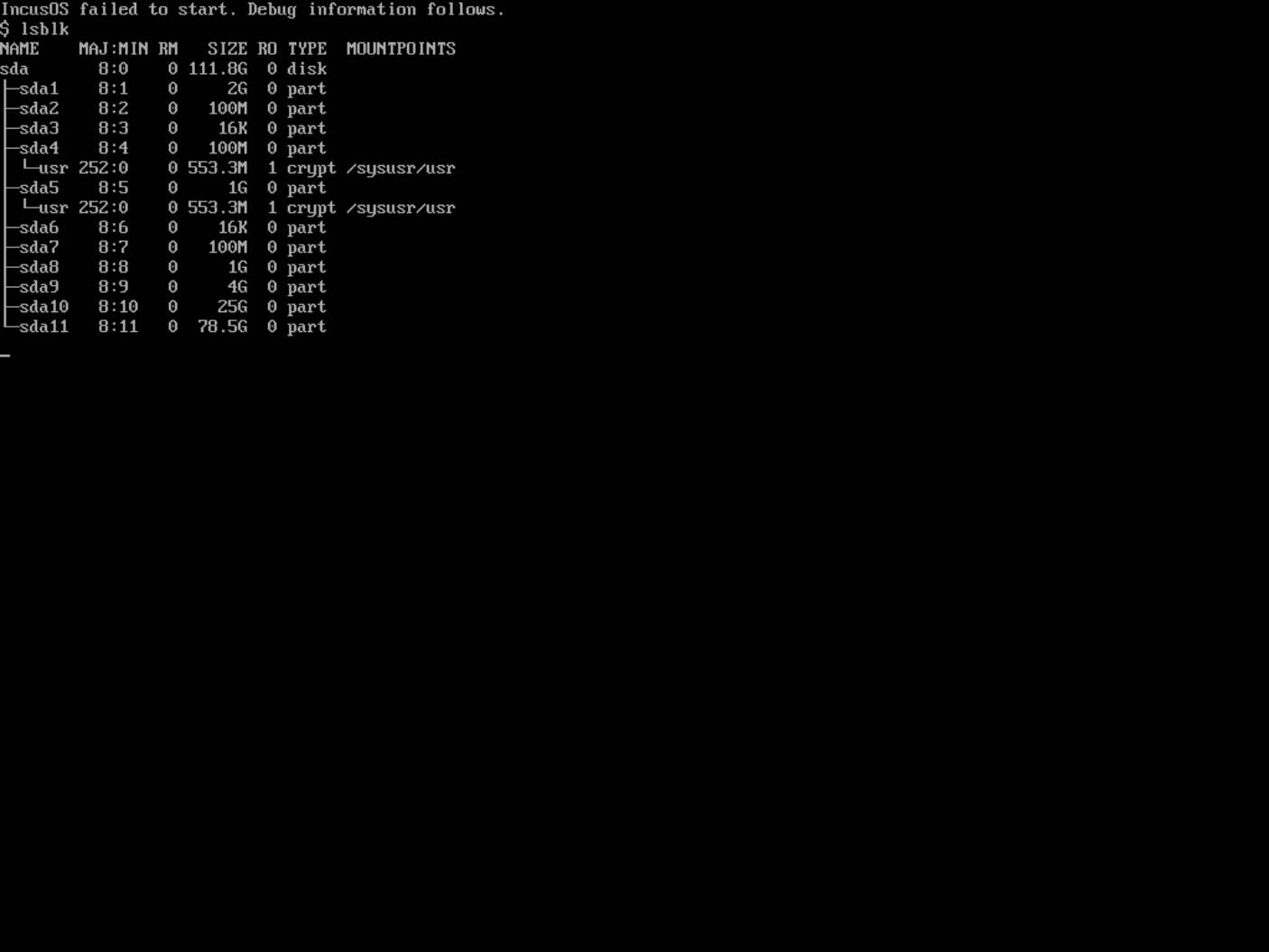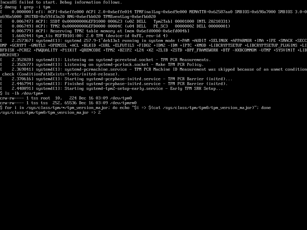 So the storage driver is OK, since we’re clearly getting far enough into the boot process for systemd-repart to create the last three partitions. But I don’t see either swap or the root partition active in the lsblk output, which isn’t a good sign. Typically this will occur if something’s wrong with the state of the TPM that IncusOS expects to see. Since this system is trying to run directly from the USB drive, we haven’t yet been able to run the normal IncusOS pre-start checks which include checking the TPM.