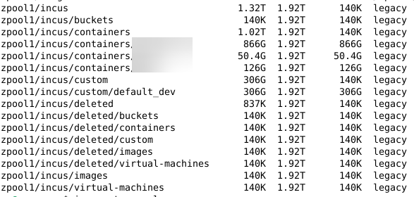 zpool1/incus is source of my incus zfs storage pool, what is /custom/default_dev and why is it using so much space (306G)?