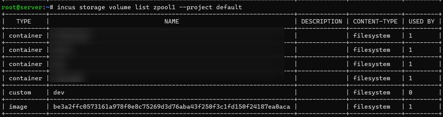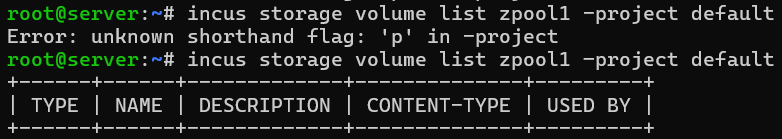 incus storage volume list zpool1 –project default should show it