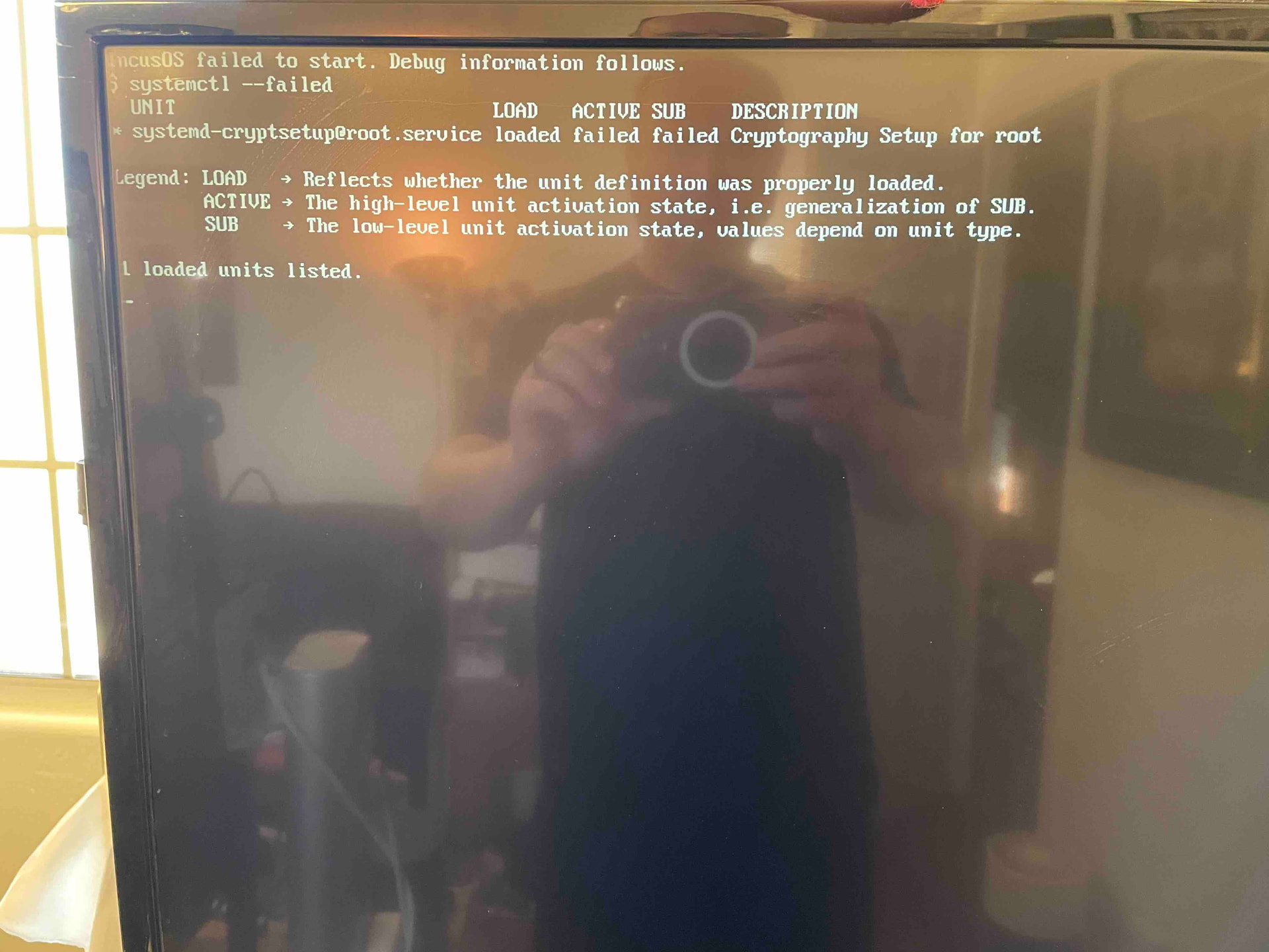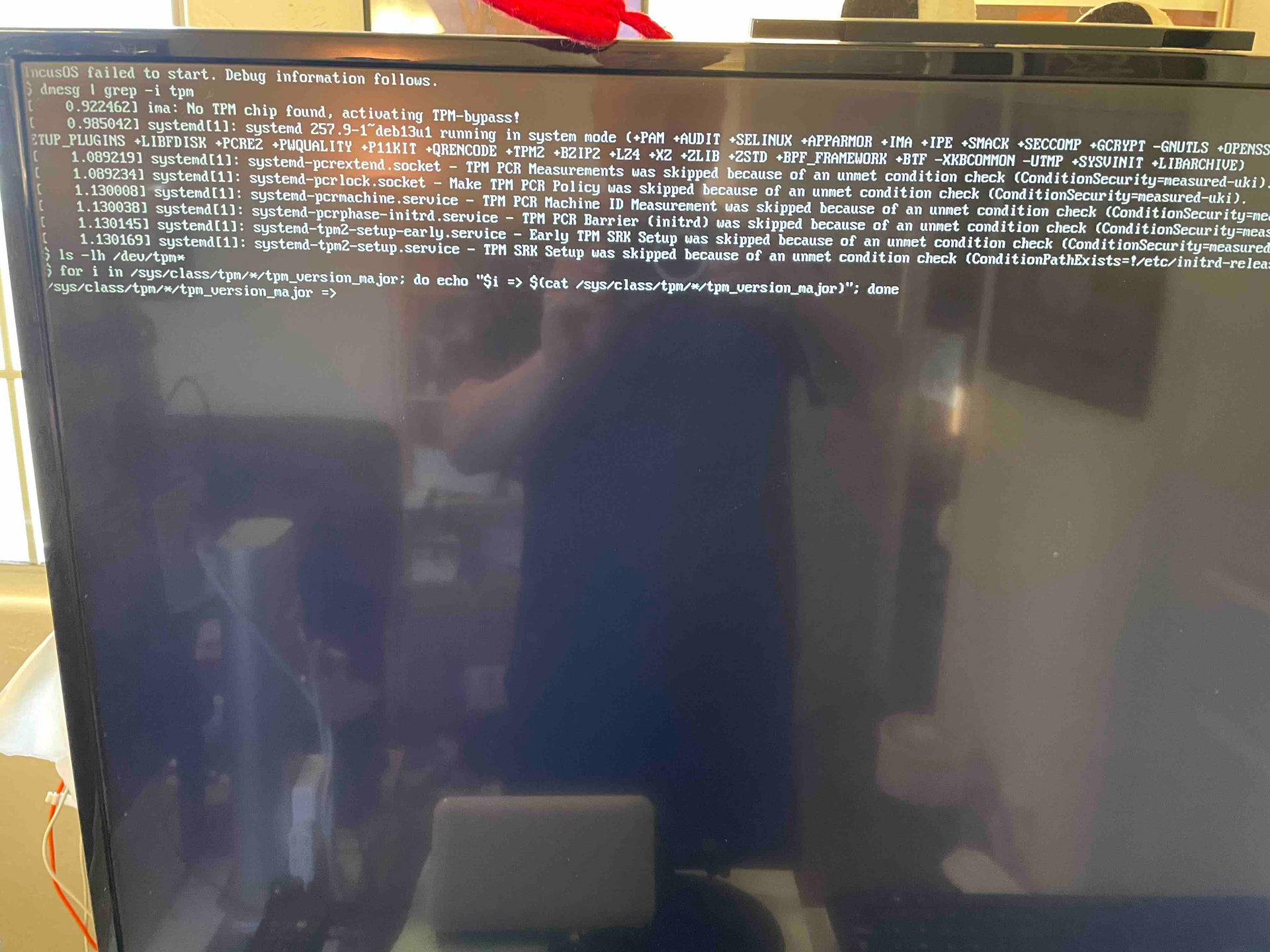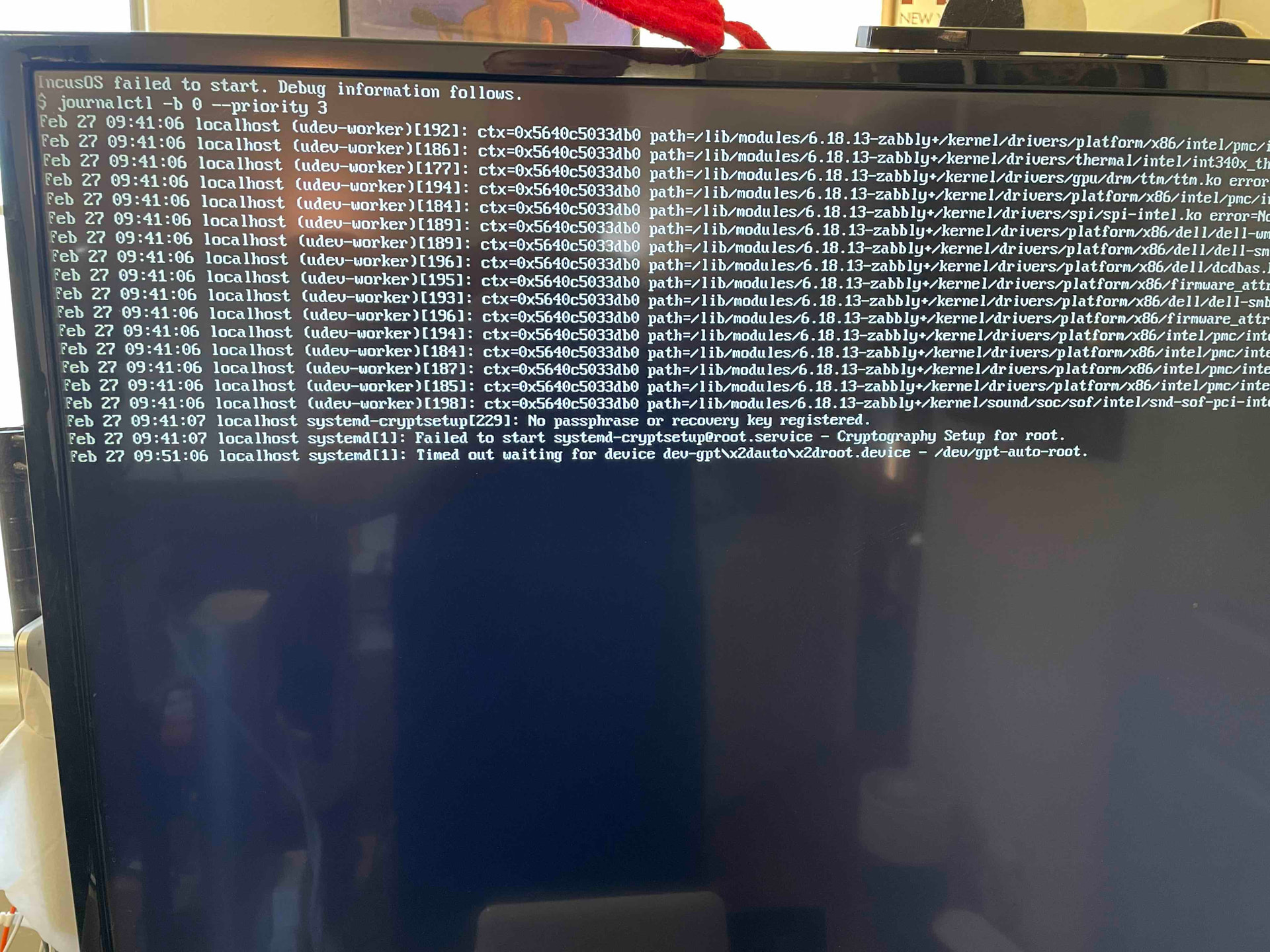 I grabbed my TLS off my cluster and generated a USB key. I forgot to disable the TPM hardware and it booted up to the curses screen and told me it was detected and couldn’t continue. I disabled the TPM in BIOS and tried again and at the ‘booting incus’ banner, it mentioned that it was falling back and hung there for a while and then dumped debug that it had failed with systemd-cryptsetup